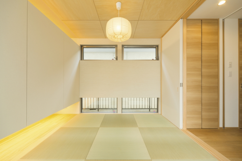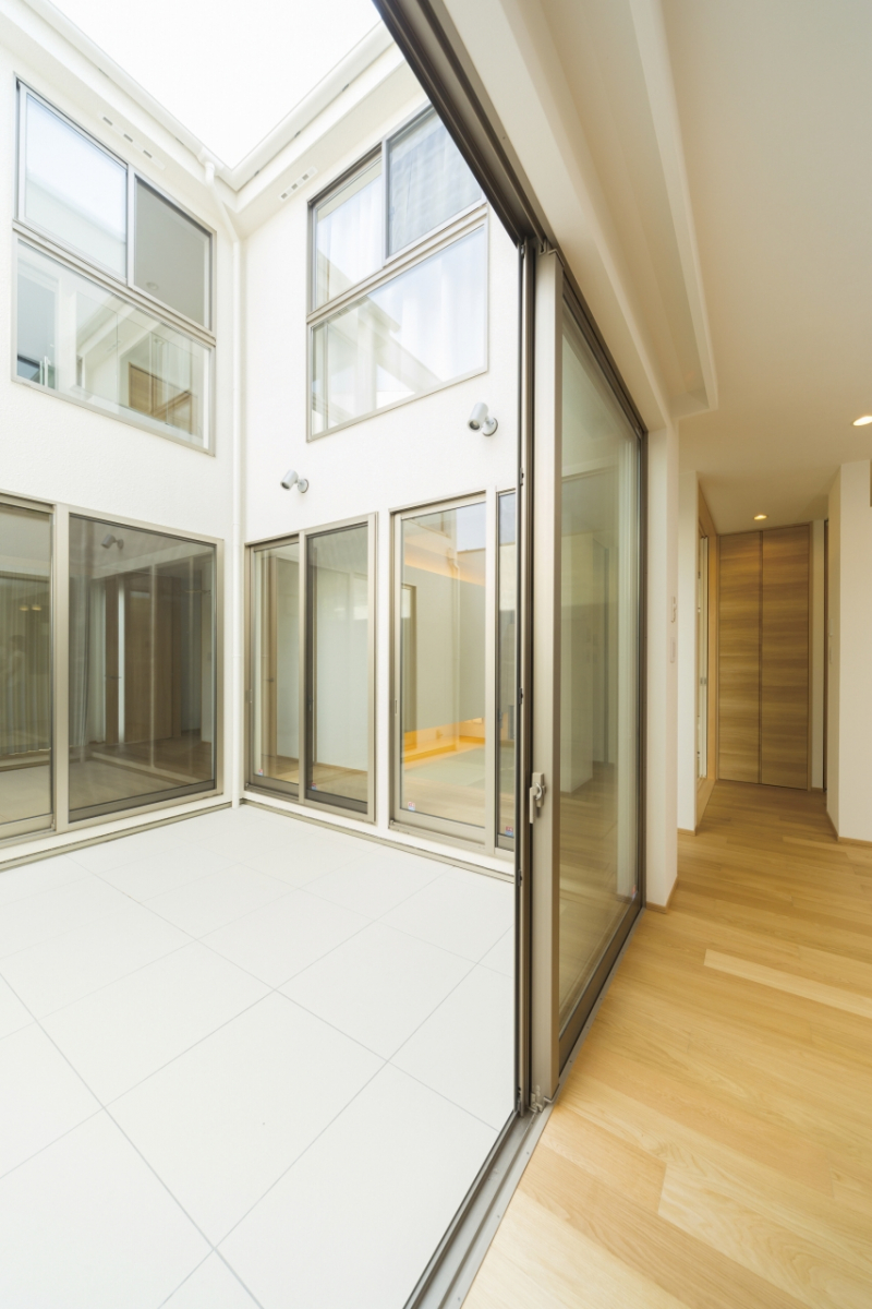 日差しを最大限にいかすために、家をコの字型に設計。中庭を広くして、プライベートなスペースをつくりました。内装デザインは、和洋折衷でモダンな印象に。洋室でも、木の素材を多く使うなど、あたたかみがある雰囲気にしました。リビングに隣接する畳の和室には、風通しをよくするために地窓を取り入れました。ゆったりとくつろげる落ちついた空間に仕上がっています。
