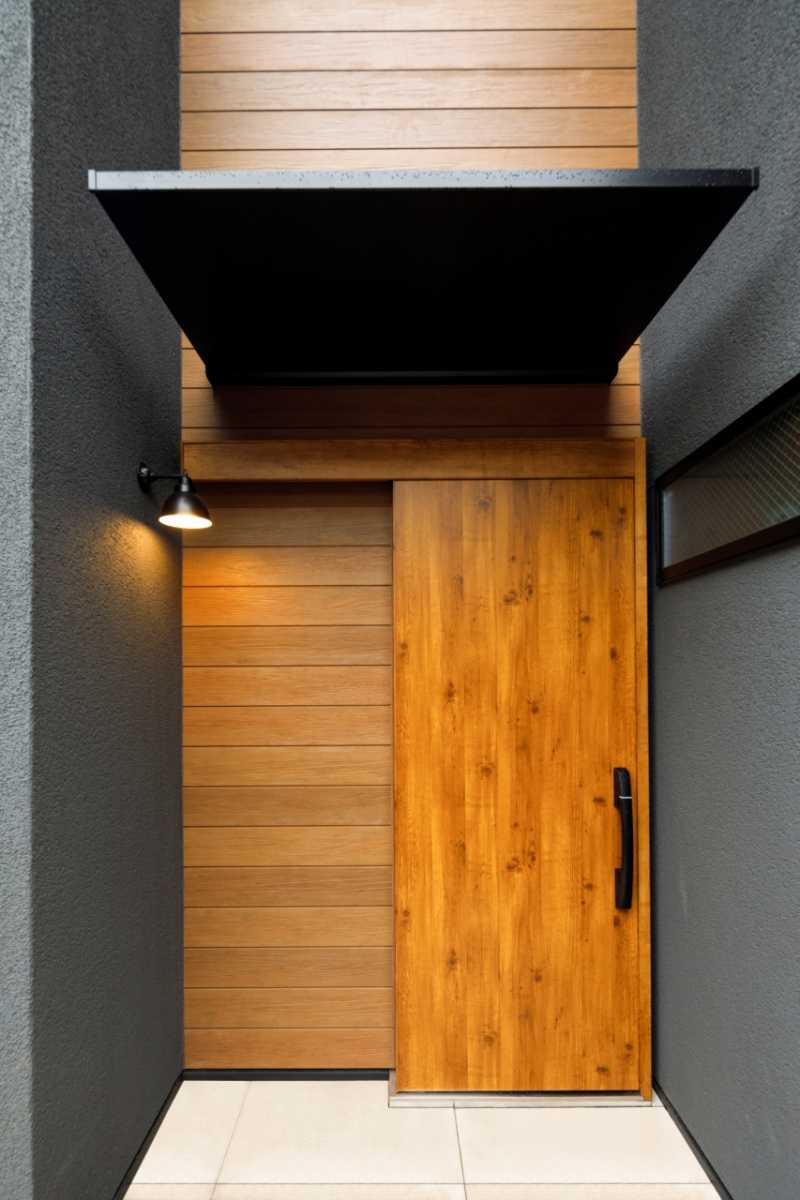 伝統的な鈍色(にびいろ)に木目調のアクセントが効いたシンプルで有機的な外観のお家です。室内との繋がりが一体的で自然に感じられる意匠が凝らされています。