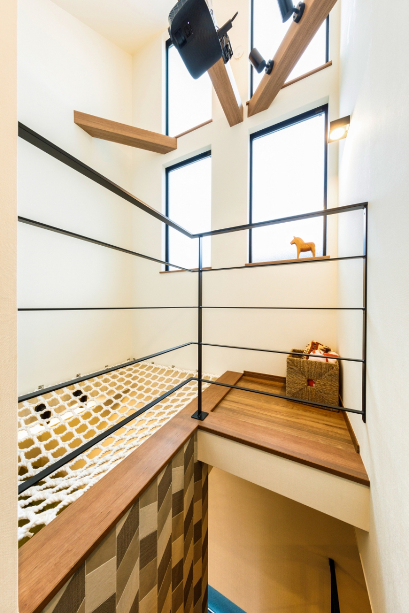 吹き抜けには強靭なネットを張り、お子様のお気に入りのスペースとなりました…ご家族皆様でプラネタリウムも楽しめるプロジェクターを吹抜けの梁に設置しています。機能性と遊び心のある伸びやかで素敵なお家ができました。